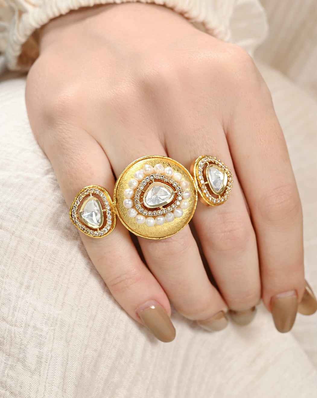 Description:- Immerse yourself in the captivating allure of our hydro kundan polki ring in 22kt Gold plated brass, a stunning creation that effortlessly combines traditional charm with contemporary elegance. Crafted with precision, this exquisite piece features hydro kundan stones. Update your style with the timeless beauty and unmatched sophistication of this unique ring.