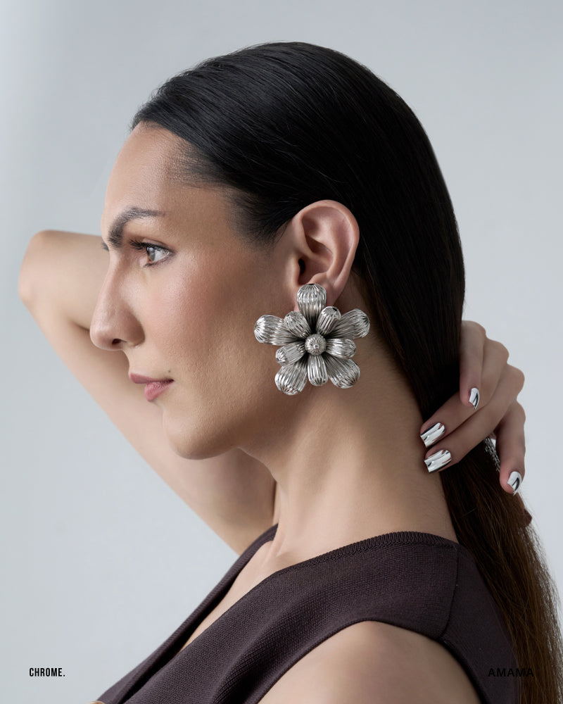 This piece is crafted to reflect a futuristic elegance, blending sleek silver tones with refined details for a look that’s both effortlessly stylish and ahead of its time.