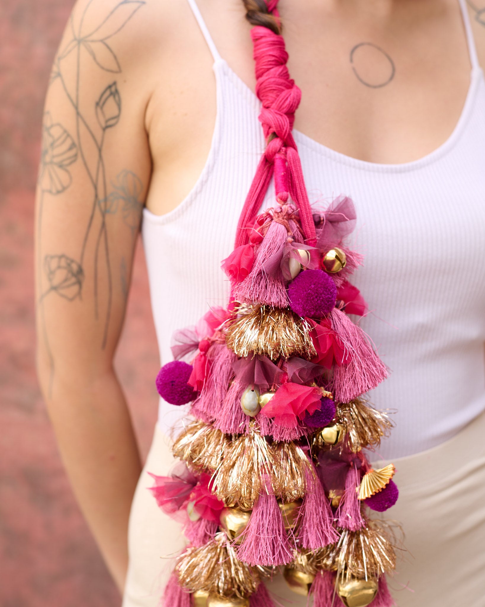 A bunch of gold and beige tassels are tied attached to create a parandi for the boho in you.