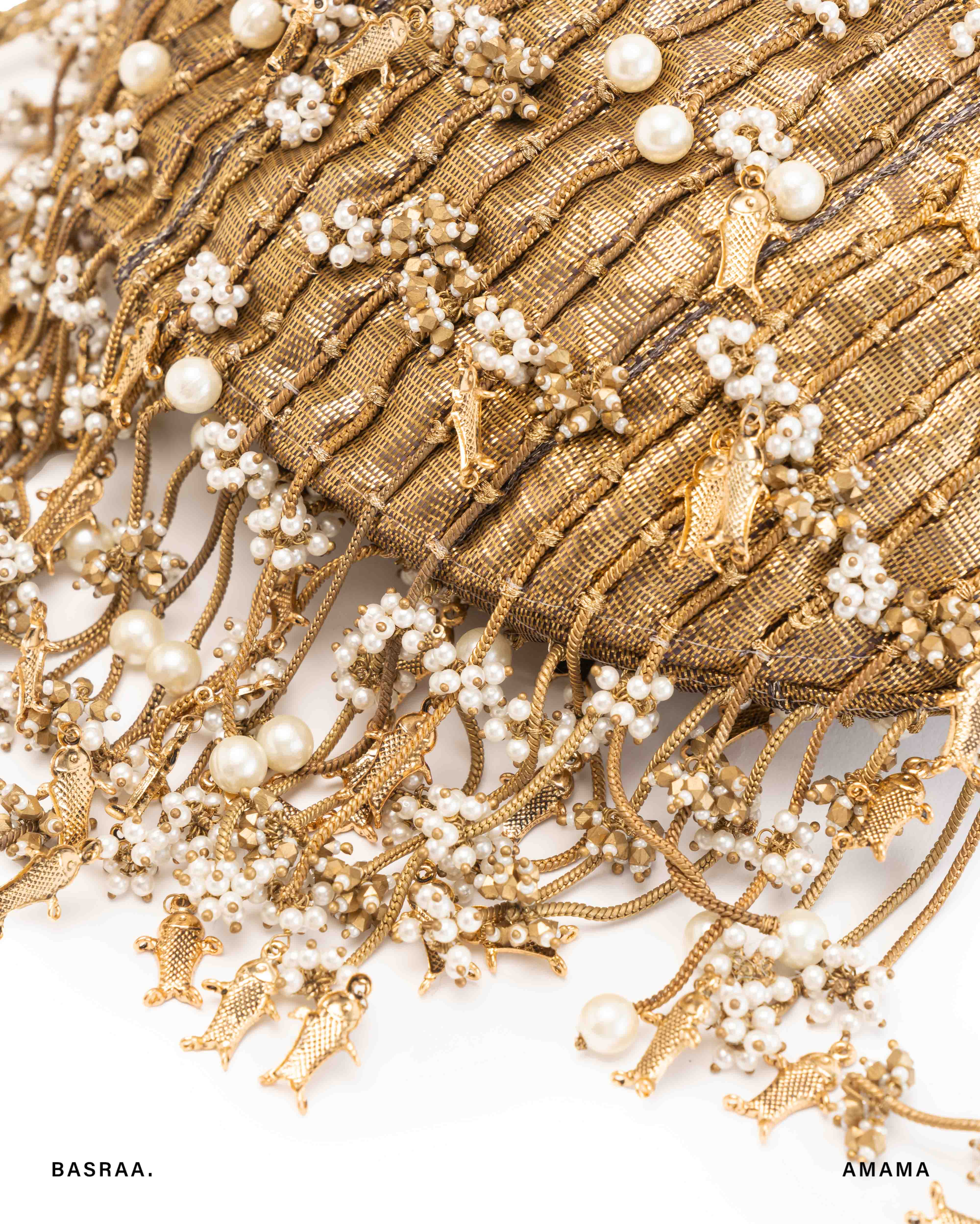 Basra Potli represents a bold reinterpretation of Afghani motifs and styles, ushering in a fresh perspective that honours tradition. This potli is a masterpiece of design and functionality, perfectly suited to carry all your festive essentials.