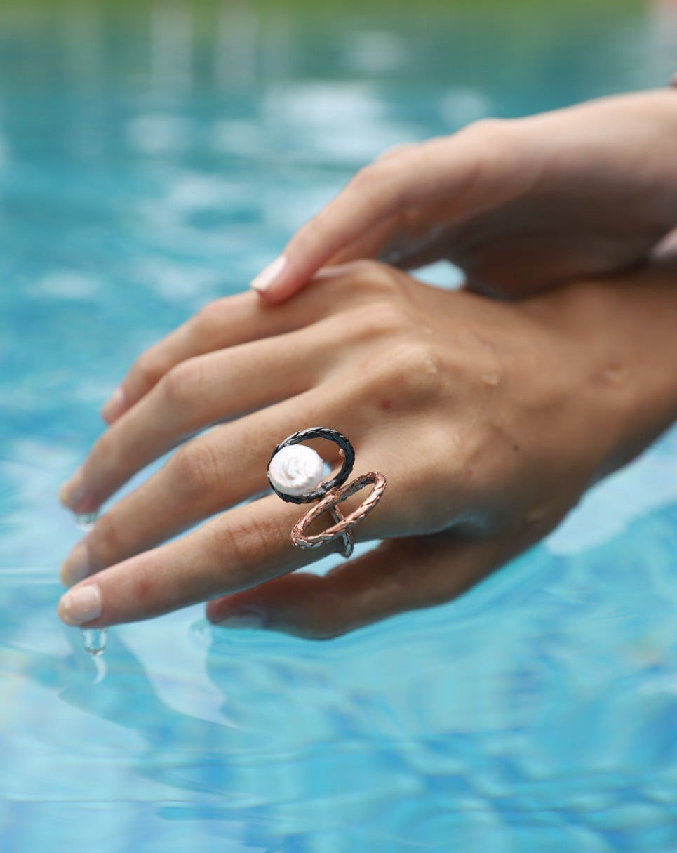Description:- A fresh water pearl coin filling up the air between the circles giving an illusion of pearl floating in the air. The ring is adjustable to all sizes.