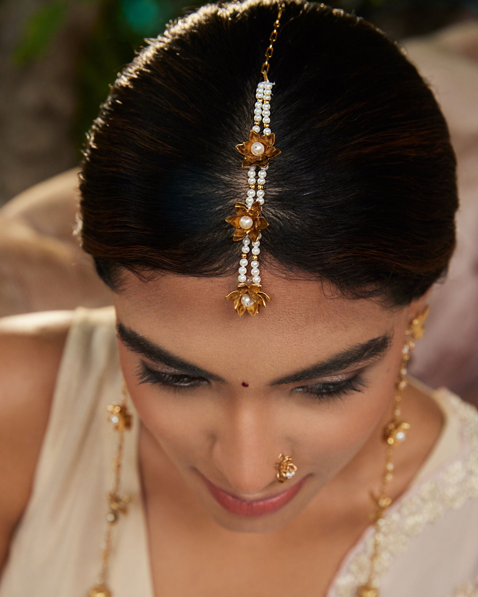 This sleek maangtika is the epitome of minimalistic elegance, featuring just three delicate lotus motifs. Its refined design offers a stylish yet traditional touch, making it the perfect accessory to elevate any traditional outfit. The simplicity of the lotus motifs adds a modern edge while preserving the timeless beauty of cultural symbolism, creating a look that is both graceful and chic. Ideal for those who prefer understated sophistication.