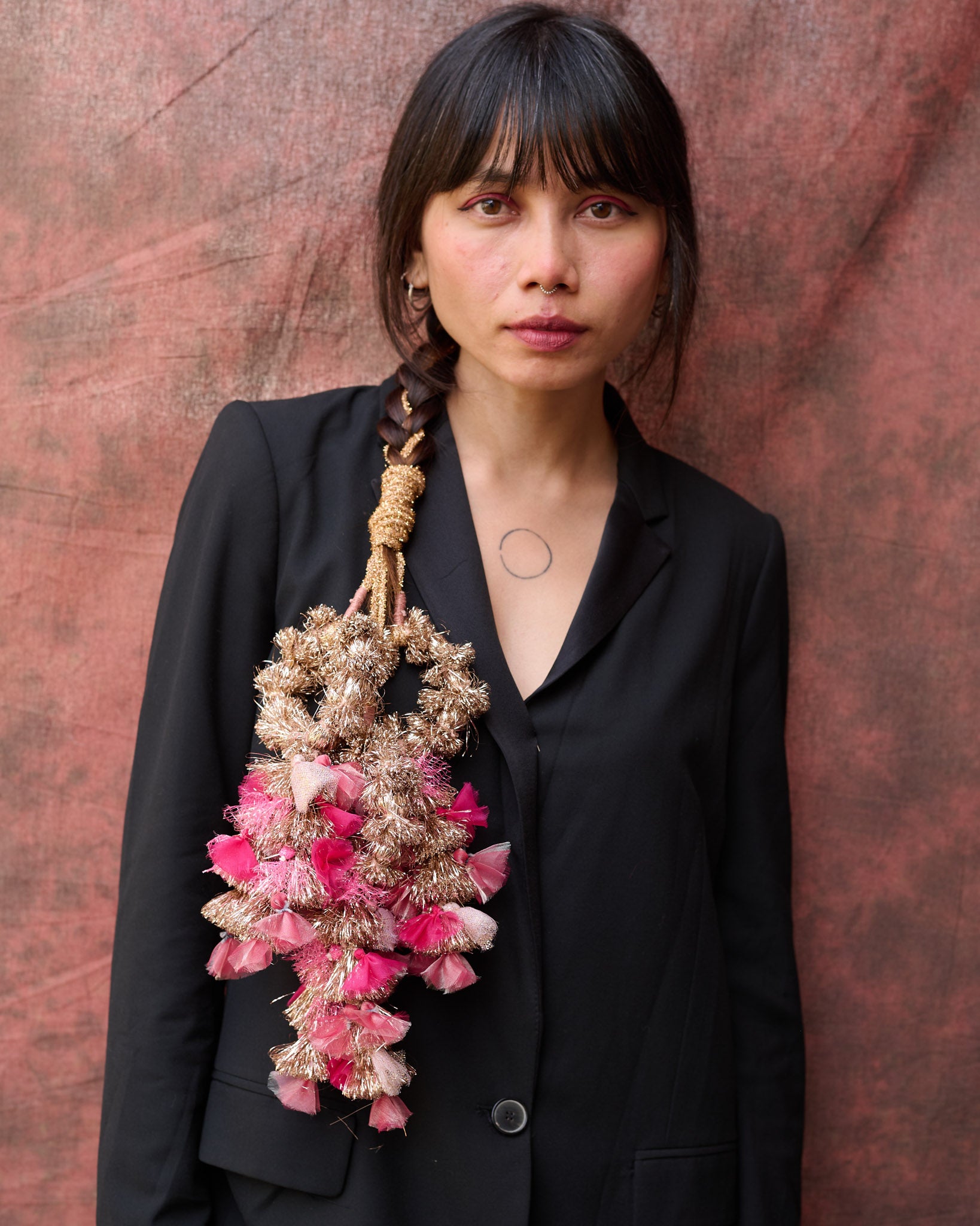 A bunch of gold and beige tassels tied attached together with cowries and ghungroos to create a parandi for the boho in you.