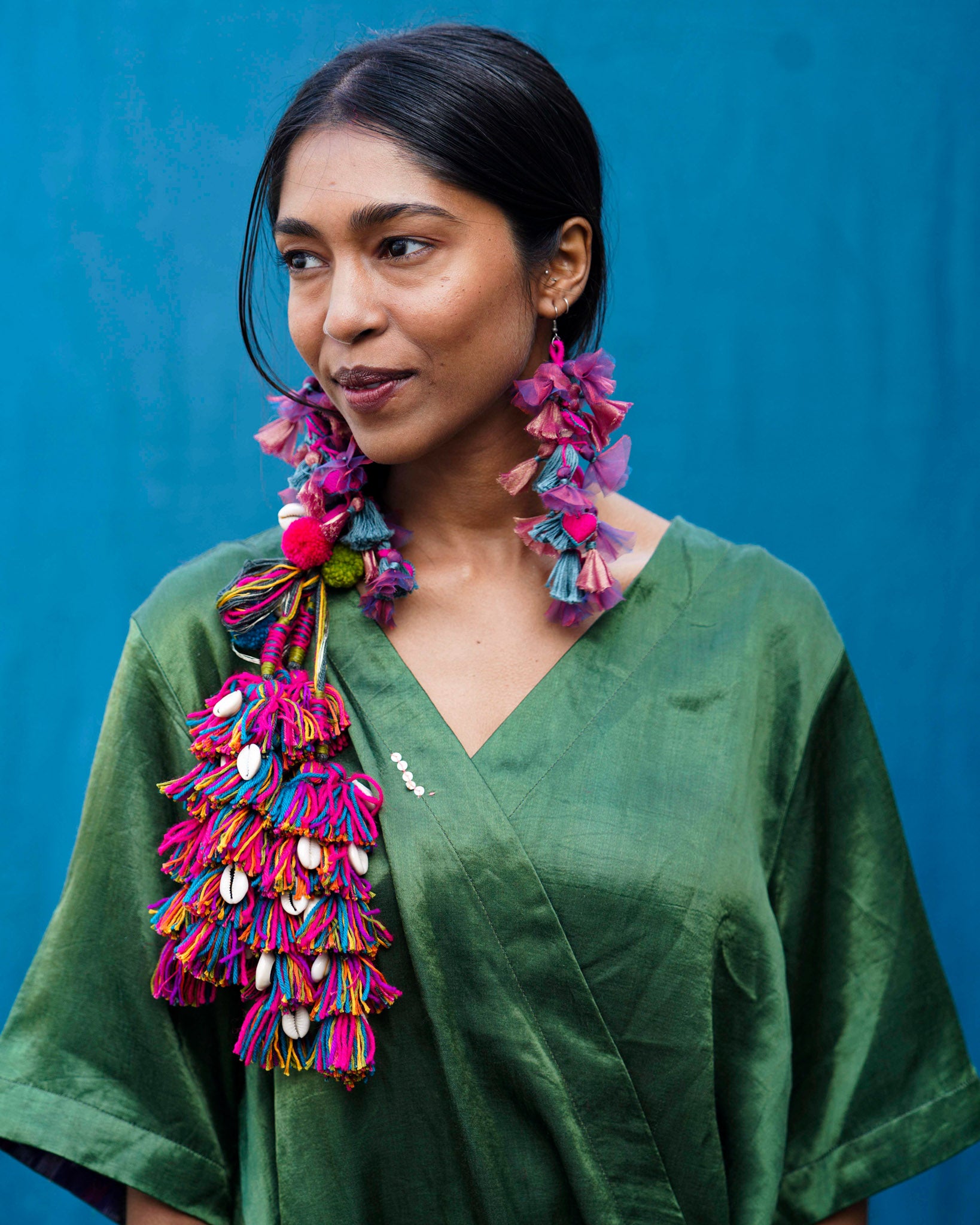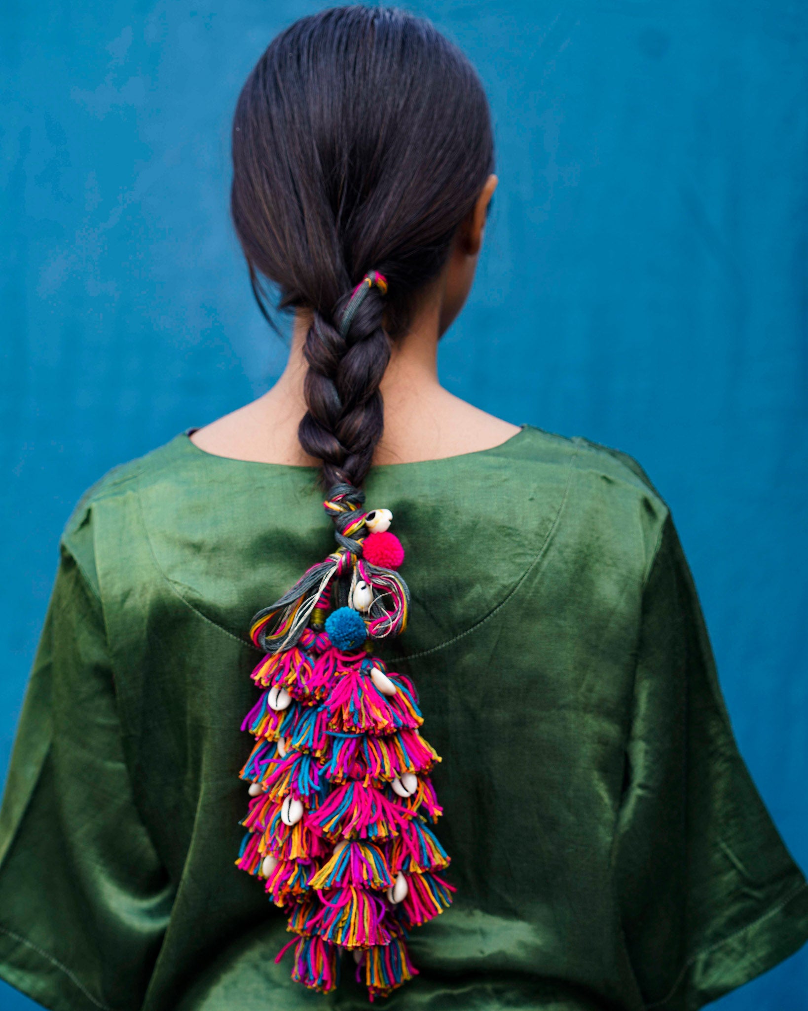 A bunch of bright coloured handcrafted tassels and poms attached together to create a perfect parandi for the boho in you.